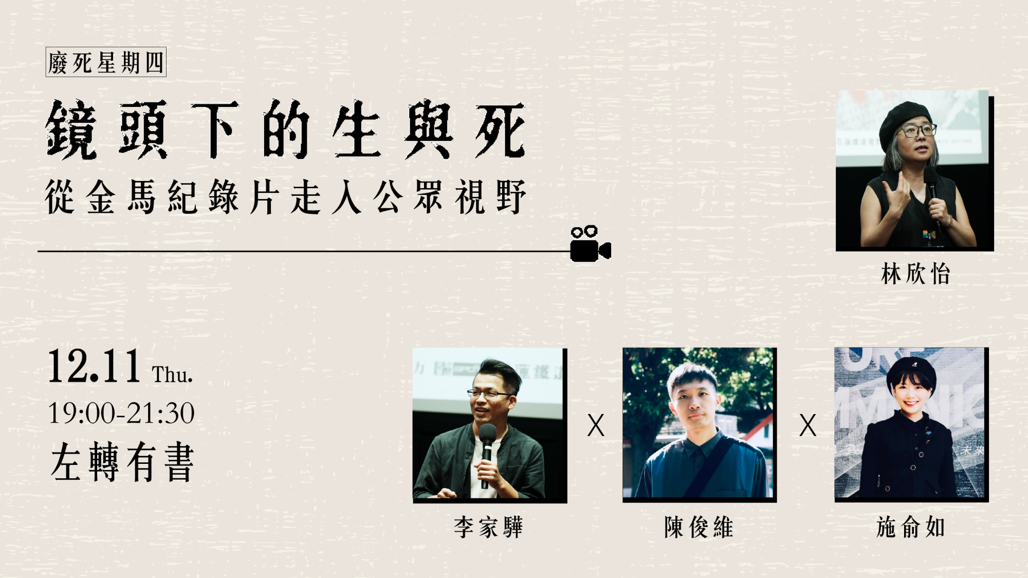 我們希望透過本次廢四的活動,讓三位影像工作者/藝文工作者與現場觀眾一同激盪更多思考與火花,也可以分享更多「用影像傳遞議題和價值」這份工作的浪漫與現實。